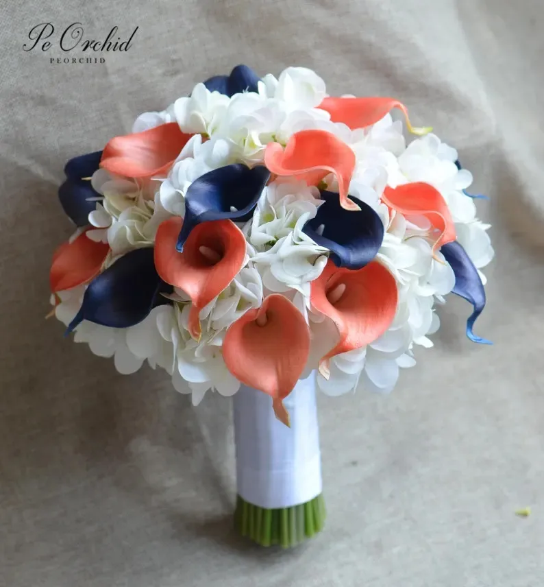 Peorchid Coral Navy Blue Bridal Bouquet Real Touch Calla Lilies White Hydrangeas Artificial Wedding Flower Faux Bouquet De Fleur Aliexpress