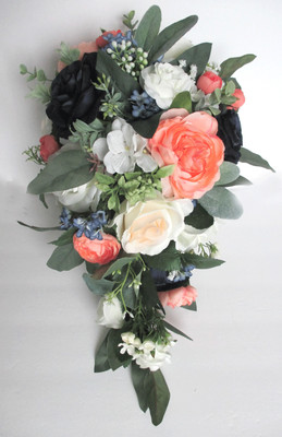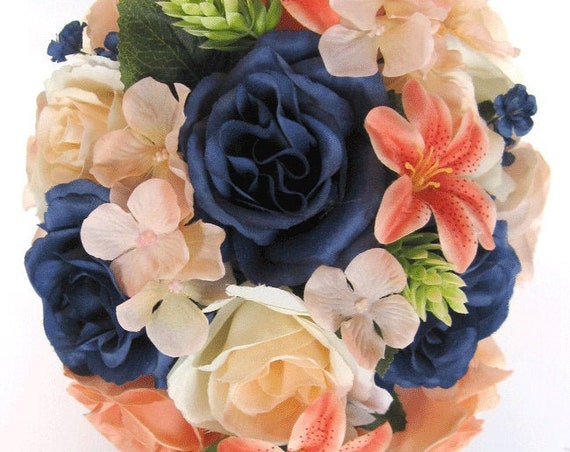 17 Piece Wedding Bouquet Set Bridal Bouquet Coral Blush Dark Navy Blue Weddings Ebay